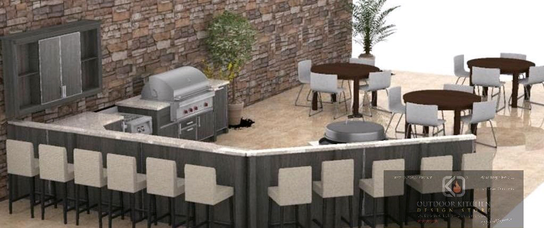 Buffet space serves much like counter space in many ways. The difference being the buffet serves a particular purpose or outdoor dining intent. Many times you envision a buffet at larger catered events. Buffet space can be modular in fashion, temporary or built into place. Buffet and counter space is relatively most important and particularly minimized when planning for your outdoor kitchen space. In fact it should be maximized. With the influx of todays trendy outdoor luxury kitchen, buffet space invites appetizers, salads, side dishes, guest dishes and deserts much like a banquet hall. The theme or lifestyle of the area outdoors can now be decorated and part of todays residential luxury outdoor kitchen. The buffet counter allows for extended periods of time spent outdoors. Too many times people think of an outdoor gathering or bbq with friends to begin with the grill and end at the table. This is no longer the case as owners loved to decorate, dine and entertain outdoors. Outdoor living can be fabulous when designed according to plan. The buffet is a priority for our design build luxury outdoor kitchens. Many of the times it becomes well accepted as a halfway point just outside the back door to supply prepared foods, foods to be cooked, beverages and guest brought delights. It eases the burden on the personal indoor kitchen as well. With todays powder coated cabinetry enabling one to match the decor and lifestyle of the owners, buffets serve themselves well. The buffet station can be flat on top as an extended counter or similar to resort types with a built in stainless tray that allows for ice to be contained and used for multiple purposes.