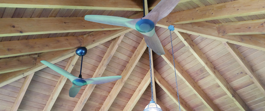 Fans can be assembled open air in the rafters of pergolas or strategically mounted in overhead beams of outdoor kitchens and pool houses.