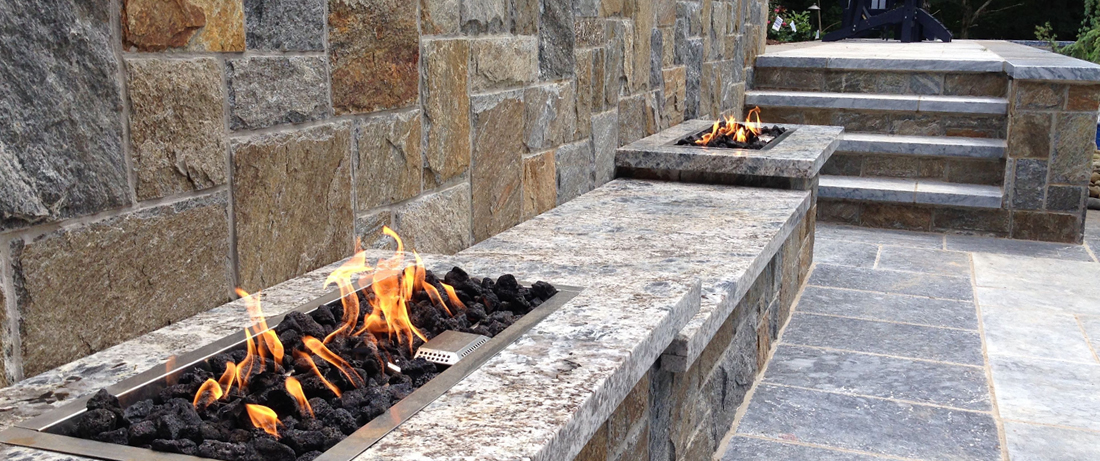 Most commonly used is the round fire pit and now bowing a close second is the linear or straight line burner that can stand alone or connect itself to another linear burner to make great lengths and custom corners. At night the efforts of design pay great dividends as guests and family cant say enough how incredible fire does look at night.