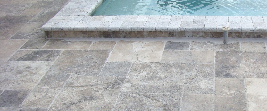 Travertine also becomes a choice of merit by Architects and upscale builders as the porous divots in the stone have a habit of collecting water droplets around the pool and additionally keeps the pool patio cool throughout the day. The porous side also seems to maintain a steadier surface feel and is considered less slippery than other stone choices.